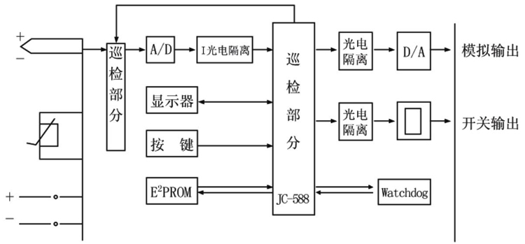 ZW-XMDA系列智能巡回顯示調(diào)節(jié)儀是由巡回測(cè)量回路,數(shù)字面板表、調(diào)節(jié)器和電源部分組成。穩(wěn)壓電源將220V市電轉(zhuǎn)換成穩(wěn)定的直流電壓作為其它部分電源。巡回測(cè)量回路則是將被測(cè)回路中的一路選定后送給A/D轉(zhuǎn)換后輸送到JC-588專(zhuān)用中央處理器進(jìn)行處理后,不僅要送到數(shù)字面板表,而且也要送到調(diào)節(jié)器,與設(shè)定值比較后按調(diào)節(jié)規(guī)律輸出控制或報(bào)警信號(hào)。