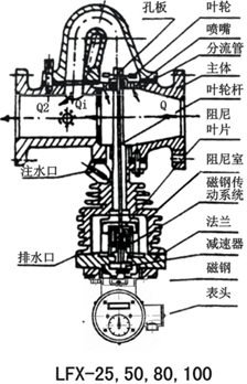 當蒸汽進入本體后,因孔板或噴嘴的節流作用,其中一部分蒸汽經分流進入本體的斜孔分流管道,噴射旋翼葉輪,形成一個轉矩,葉輪軸下部裝有阻尼葉片,阻尼葉片在注滿水的散熱器體內旋轉,使葉輪的旋轉受到阻尼作用,這樣葉輪就能有效地吸收射流的動能,使葉輪軸在葉輪的轉矩和阻尼片的制動轉矩相平衡的轉速下旋轉。進入本體的蒸汽是按一定比例分流到分流管道中的,而葉輪的轉速與分流量大小成正比關系,所以葉輪的轉速與通過的全部蒸汽流量也是成正比關系,葉輪軸的旋轉借助減速齒輪改變至合適的速度,再通過磁性聯軸器傳至計數器的指針,在表盤上即可直接讀出蒸汽的流量數值。配裝脈沖發生器,便可實現遠傳顯示。具體如圖:
